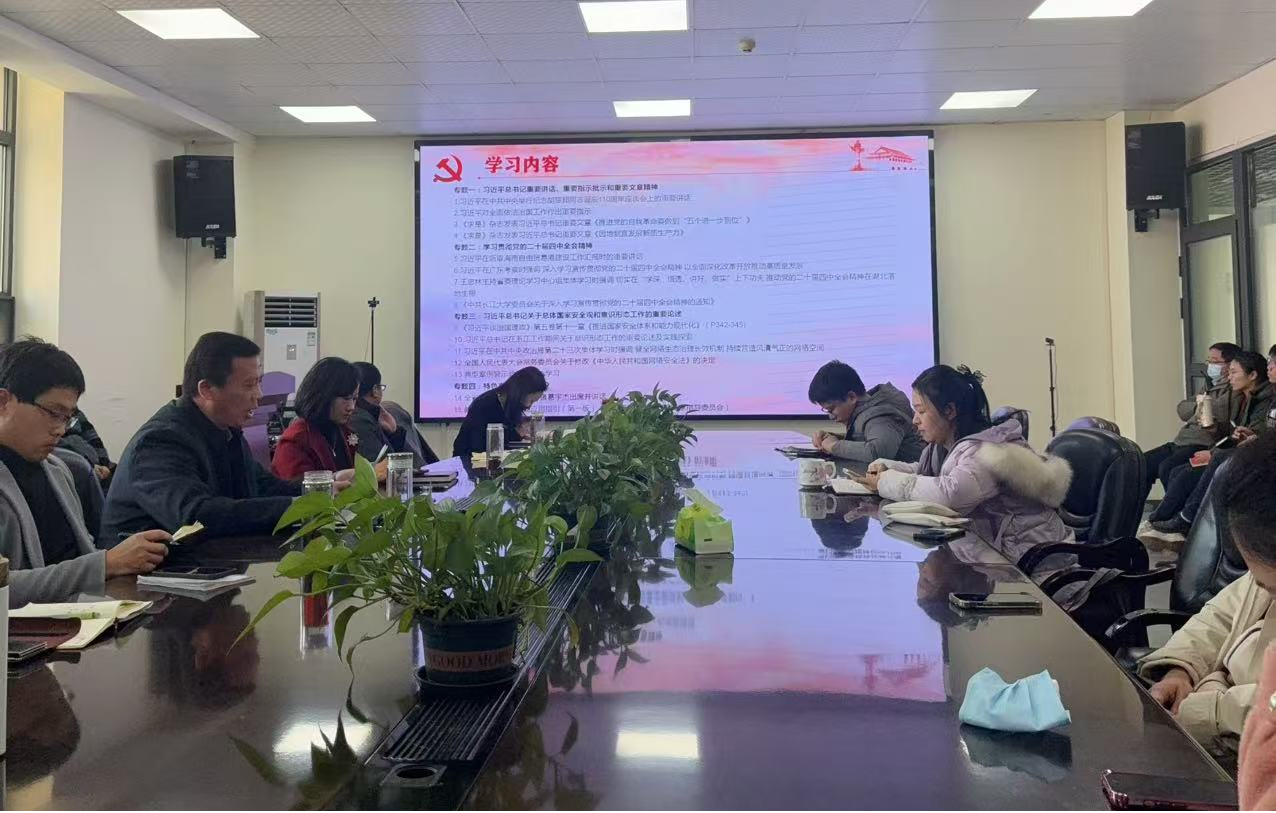 党委书记王辉组织全体教职工开展了12月份政治理论学习,重点学习了习近平总书记关于总体国家安全观和意识形态工作的重要论述、党的二十届四中全会精神等专题,通报了身边教职工违纪违法典型案例,开展了警示教育,组织了相关纪法条款学习。王辉向全体教职工提出三点要求:一、时刻紧绷纪律规矩之弦,以案为鉴,遵纪守法,坚决杜绝违法违纪行为发生;二、真心实意关心关爱学生,班主任和导师及时了解并解决学生实际困难,做好心理危机干预;三、积极配合完成相关工作,要以高度的责任心和主人翁精神完成第四轮聘期考核数据填报、人事档案缺失材料补充及养老保险个人部分补缴确认等相关工作。