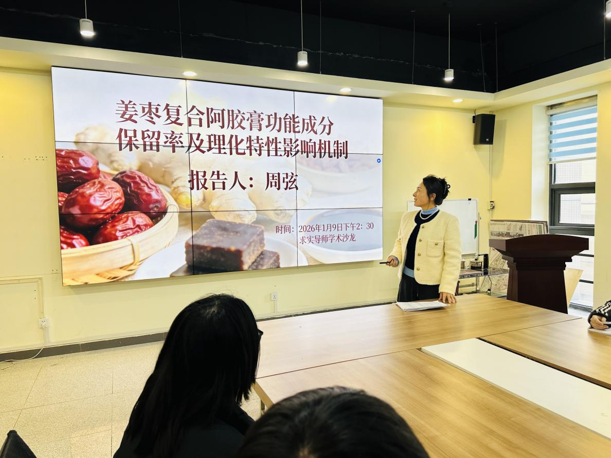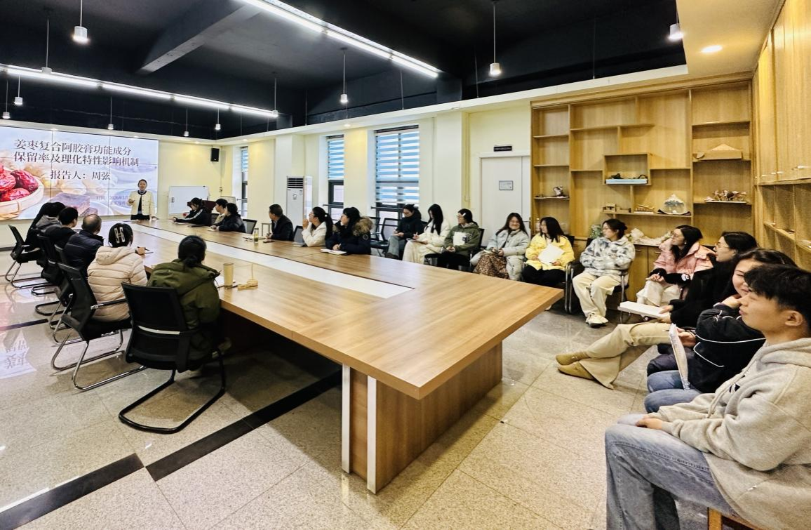 会议现场,周弦老师结合实验数据与理论研究,深入剖析了姜枣复合阿胶膏在生产加工过程中功能成分保留的关键因素,以及各类条件对产品理化特性的影响机制,为师生们呈现了该研究方向的最新进展。参会人员围坐长桌认真聆听,不时记录要点,并在汇报后围绕配方优化、工艺改进、成果转化等实际问题展开热烈探讨,分享行业经验与研究思路。