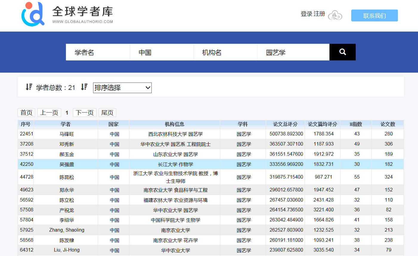 近日,国内全球学者库网站(http://www.globalauthorid.com/)公布了“全球顶尖前10万科学家排名”。我院bv伟德国际1946吴强盛教授以论文总评分333556.9692、论文篇均评分1832.731、论文数182、H指数30,入选该项排名,位居全球42250名,在国际园艺学科排名第23位,国内园艺学科排名第4位。