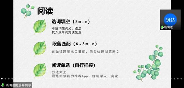 会上,学长学姐纷纷慷慨解囊,结合自身的英语四级学习与备考经验为2019级同学们分享了满满的干货,为同学们安利了“百词斩”、“扇贝”、“墨墨”等高效英语学习软件,同时,建议同学们在英语学习过程中找寻适合自己的学习方法,有针对性地指明了应对四级考试的策略。例如:景园31801班陈佳如介绍了她的英语口语练习方法,每天半小时在“abobo”学习软件里熟读一篇文章,不仅练习了口语,还能积累词汇量,找一个和自己实力相当的小伙伴搭伙练习,这样对口语提升有很大的帮助。景园31701班项明达为会议准备了PPT,从四级考试的各类题型进行了具体的备考技巧讲解,使学弟学妹们对英语四级考试有整体而细致的了解,以便熟练应考。在答疑环节学长学姐们对同学们提出的问题一一倾情解答,给出了备考过程中的建议和帮助。
