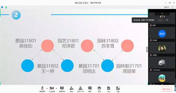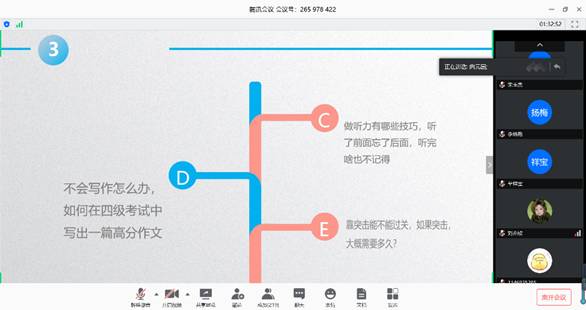 会议历时一个半小时,分四项议程展开:2019级学委汇报本班英语四级学习情况、学长学姐经验分享、在线咨询与答疑、年级辅导员雷静总结寄语。