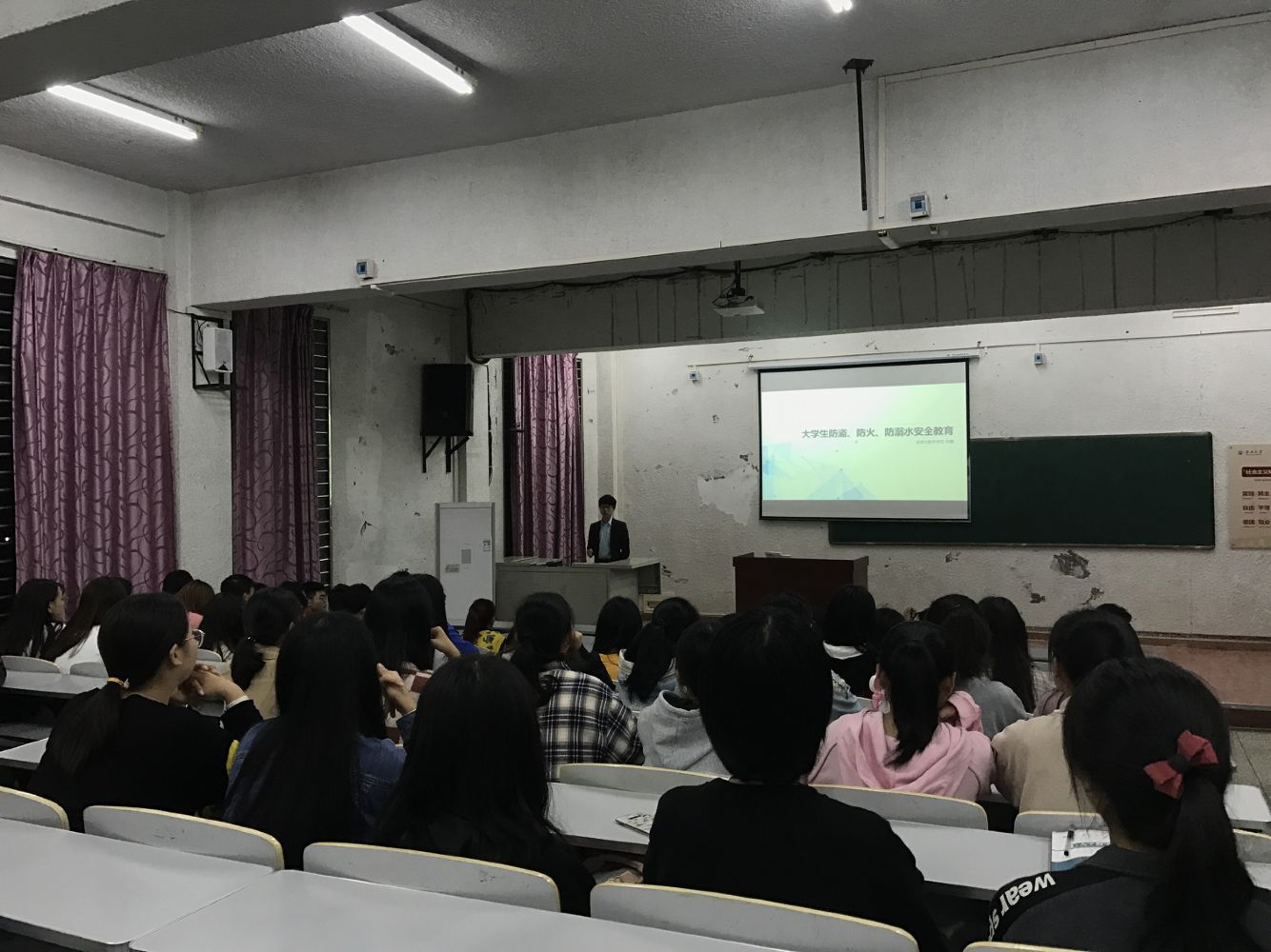 为全力打造平安校园、和谐口岸,坚决遏制隐患问题,进一步提高学生的安全意识和自防自救能力,11月5日20:00-21:00,在5教503,数信学院钟赛老师给大家讲授了《大学生防盗、防火、防溺水安全教育》。本次讲座钟塞老师针对当前大学生的状况,系统介绍了大学生安全教育的放盗,防火,防溺水这三个方面,接着又为我们讲述了几件相关案例,以及遇到危险时的求救和自救措施。在讲述的过程中,诙谐幽默的语言,缓解了紧张的气氛,同时让在场的每一位老师和同学既学习到了相关知识,又感到轻松愉快。通过此次活动进一步强化了老师与同学们的安全常识和防范意识。