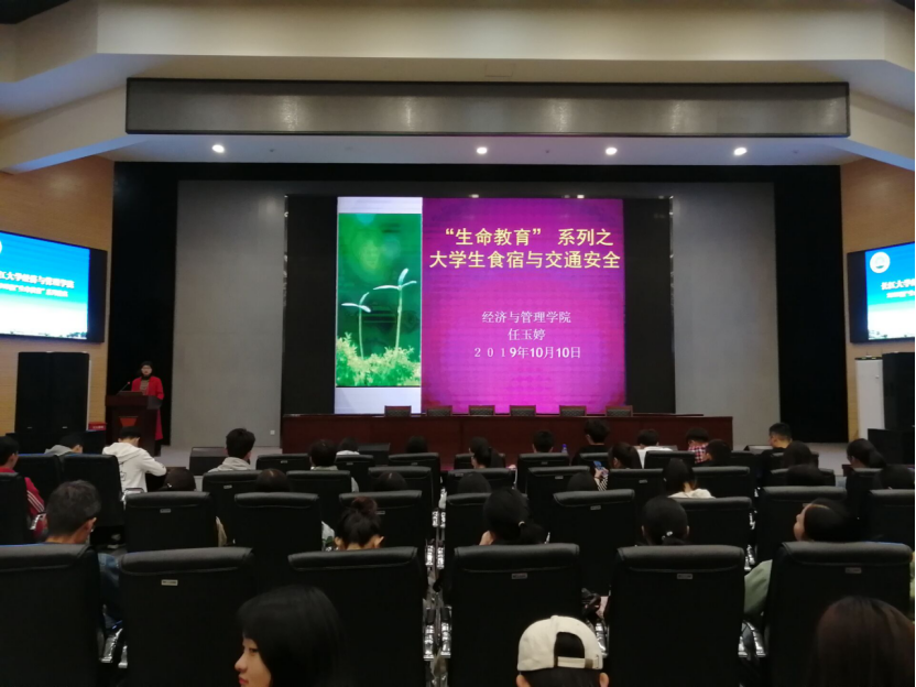 11月4日晚7点——8:15在农科楼1058,经济与管理学院任玉婷老师以《大学生食宿与交通安全教育》为题给大家做了报告。首先任老师以餐桌上的地沟油,面粉增白剂掺石灰和双汇瘦肉精猪肉三个实例给同学们敲响警钟,本次活动使食品安全知识得到更广泛、更深入的宣传,营造一个食品安全大环境,接着任玉婷老师引导同学们学习了长大禁酒令及相关案例,活动现场,她以鲜活的文字介绍和图片展示向师生详实解读,呼吁同学们在校期间绝不沾酒,以多个案例提醒同学们注意出行安全。