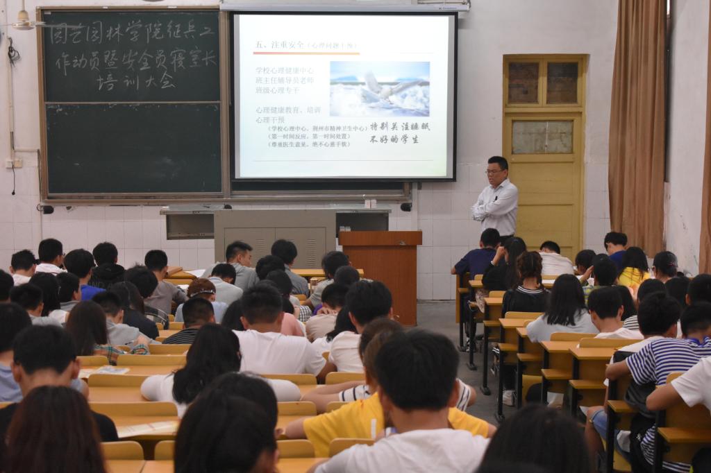 随后,孙老师就安全员、寝室长培训问题也做出了详细的指导。他围绕“两大类重点安全问题的常识与技能学习”、“三大学校生命安全问题”、“大学生常见安全问题的防范与提醒”、“学生干部如何做好安全教育第一道屏障工作”等几个问题做了详细的解说。特别指出大学生要尤其注意防溺水,防火灾,防诈骗,防传销等几大高频安全问题,加强安全防范意识,尊重生命、爱惜生命。