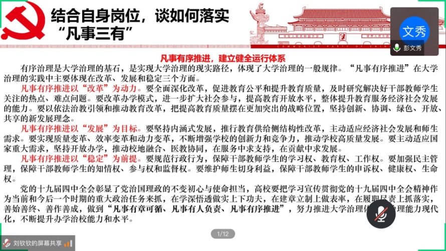 会议最后一项结合冯征校长对于如何将“凡事三有”推进大学治理现代化的文章进行学习,认识何为“凡事有章可循、凡事有人负责、凡事有序推进”。