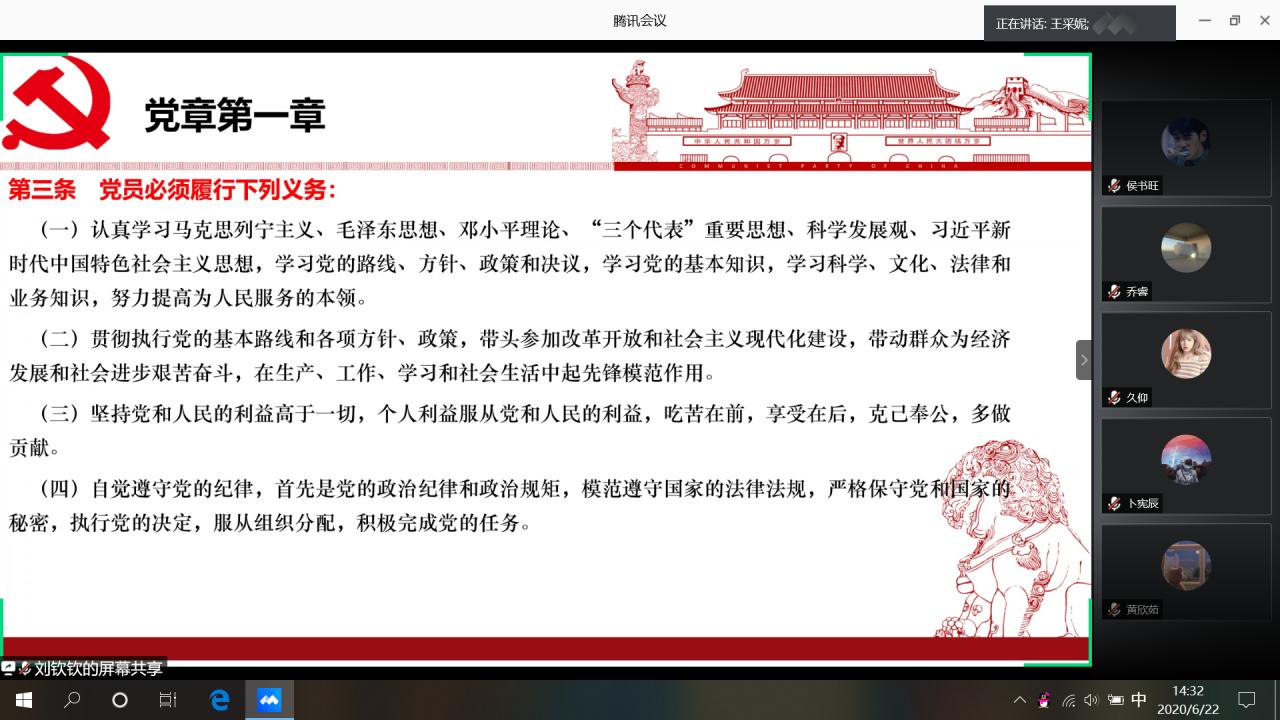 (通讯员:刘钦钦 王采妮)2020年6月22日下午2:30,bv伟德国际1946本科生党支部通过腾讯会议的方式开展六月主题党日活动,支部书记彭文秀出席了会议,全体党员准时到会,会议由刘钦钦和王采妮同志主持。