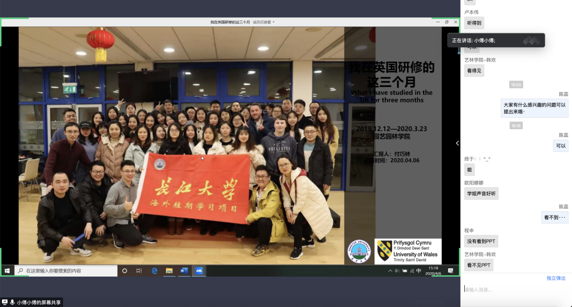 随后,张俊和付巧林两位同学图文并茂的分享了他们在海外交流的心得和体会。分别从三一圣大学的教程安排,学术收获,在英国的见闻感受等方面进行了生动的介绍。付巧林同学说,在国外她感受到更自由的学术讨论氛围,学习到了丰富的自然科学专业知识,强化了批判性思维能力。张俊同学表示,此次疫情期间出国交流最大的感受在于深深的体会到了祖国的强大,虽然回国路艰,但是在学校领导和老师们的关心和帮助下能够安全回国非常感恩。最大的收获在于跨文化交流技能提高和团队精神培养。最享受的是来自不同国家、不同专业同学们取长补短、相互协作、共同克服困难的过程。