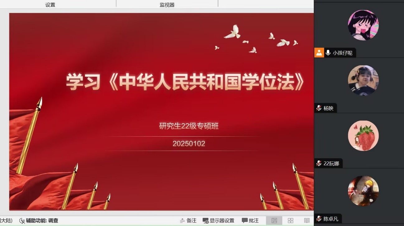 (通讯员 张艺)为响应国家教育法治化的号召,全面落实《中华人民共和国学位法》的指导原则,bv伟德国际1946于2024年12月30日-2025年1月3日积极组织全体研究生以班级为单位集体学习《中华人民共和国学位法》。