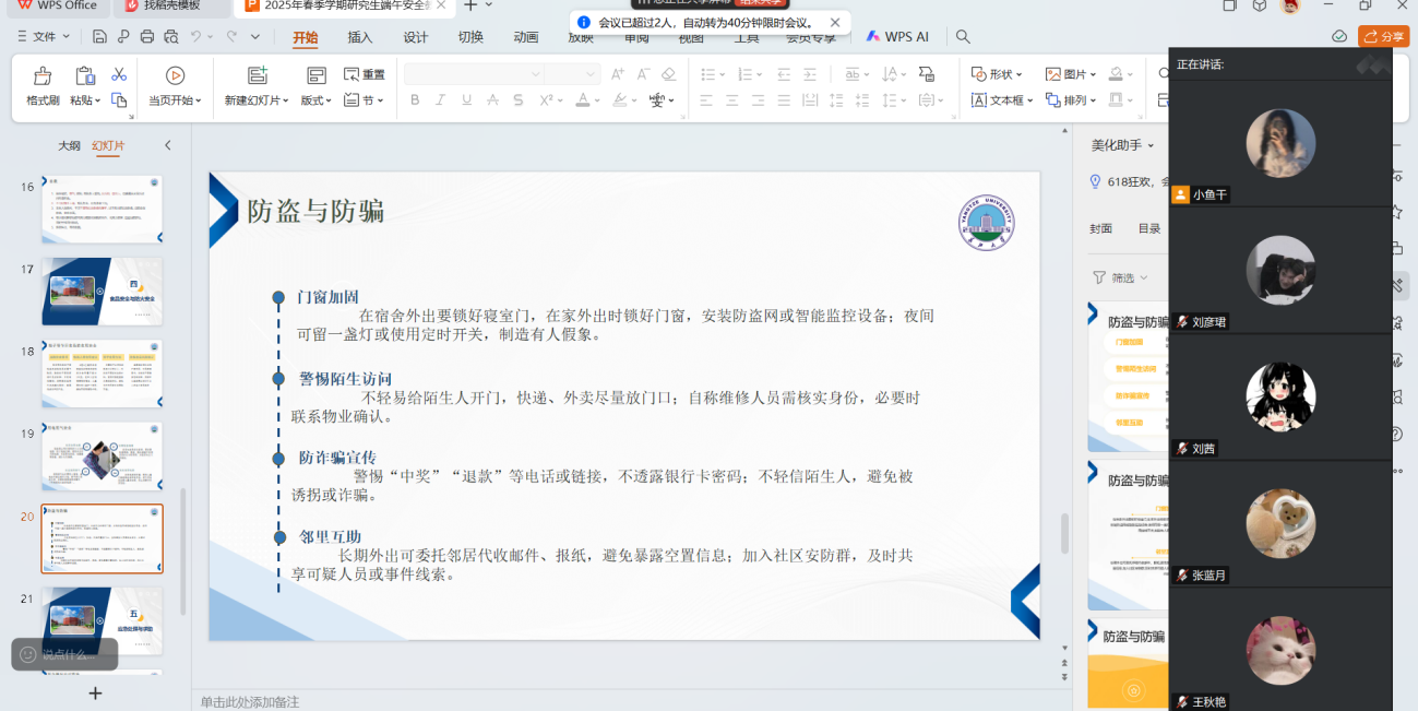 班会重点聚焦于假期安全,结合典型案例从离校安全、就业安全、防诈骗安全等方面进行了详细讲解,重点强调了离校期间宿舍安全、交通安全、财产安全等注意事项,要求全体研究生提高安全意识,确保平安离校。