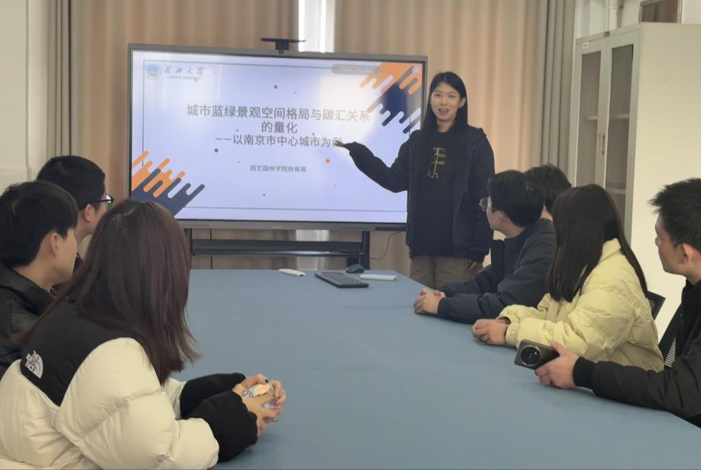 学术汇报环节,来自两院的研究生代表依次登台分享研究成果,展现了扎实的科研功底与创新的学术视角。来自bv伟德国际1946研究生杨佩瑶汇报主题为《城市蓝绿景观空间格局与碳汇关系的量化——以南京市中心城市为例》,该研究以南京市中心城区为对象,围绕蓝绿景观空间格局与碳汇的关联展开探究。针对以往城市碳汇研究多孤立关注蓝、绿空间,且缺乏中心城区蓝绿协同固碳机制分析的不足,确立了探究蓝绿空间协同碳汇影响、识别关键格局指标、提出空间规划优化方法三大目标。明确了蓝绿景观格局对碳汇的显著影响及协同作用,为中心城区蓝绿空间的规划、管理和生态修复提供了科学技术支撑。